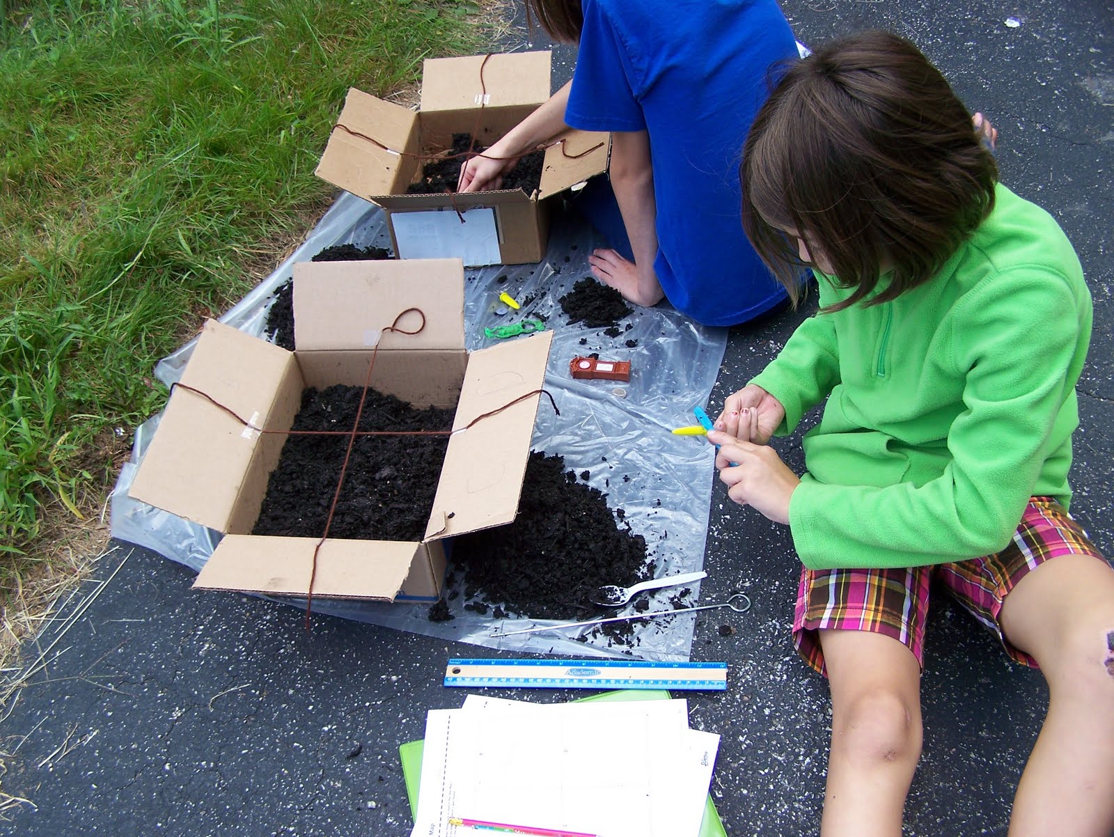 The girls found out today just how hard and tedious it is to be a paleontologist, a person who studies fossils. In their fossil dig they had to go very slowly so they didn't disturb the soil around the fossils or break the fossils. Once they found a fossil they had to uncover it using a skewer then map it on there "site map" so they knew exactly where it was found. After they were able to take it out of their excavation site they had to brush it off with a tooth brush and transport it to their study to make observations about the fossil. They each had four fossils to find in their excavation site.
